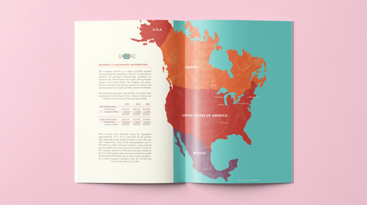 The Tootsie Roll Company owns several popular candy brands such as Dots, Charms Blow Pops, Sugar Babies, etc. The company began its course in the late 1800’s and gained popularity during the Depression Era and with soldiers due to its economical price and the Tootsie Roll’s ability to withstand different environmental pressures without melting or going bad. The company is an essential part of Americana, filing children’s Halloween baskets and bellies through the good and bad times. Going off of this piece of history, I wanted to style the annual report in a vintage feel with bright candy pastels as colors and with illustrations. The photography is bright and includes most of the candy company’s brands. I wanted to use the Tootsie’s brand color of brown as an accent color rather than the main focus not only for aesthetic purpose but to also focus on candy as a whole, rather than focus on just the Tootsie Roll/Pop.